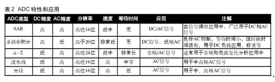 大多數(shù)信號調(diào)理應(yīng)用采用逐次逼近(SAR)或積分型ADC。這兩種ADC能很好地處理dc信號,而SAR型ADC對快速ac信號能提供更好的支持(表2)。SAR轉(zhuǎn)換器是所有ADC中最通用的,這種轉(zhuǎn)換器把高分辨率(高達(dá)16位)和高吞吐能力結(jié)合在一起。