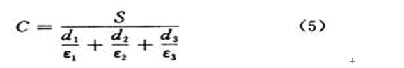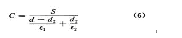 顯然,在電容器極板的遮蓋面積S,兩極板之間的距離d,被測物體上下側(cè)至電極之間介質(zhì)的介電常數(shù)ε1和ε3確定時,電容量的大小就和被測材料的厚度d2及介電常數(shù)ε2有關(guān)。如被測材料介電常數(shù)ε2已知,就可以測量等厚教材料的厚度d2;或者被測材料的厚度d2已知,就可測量其介電常數(shù)ε2。這就是電容式測厚儀和電容式介電常數(shù)測量儀的工作原理。