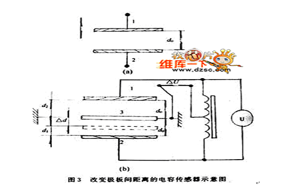 圖3是這類傳感器的原理圖,圖3(a)由2塊極板構(gòu)成,其中極板2為固定極板,極板1為與被測物體相連的活動極板,可上下移動。當極板間的遮蓋面積為S,極板間介質(zhì)的介電常數(shù)為ε,初始極板間距為d0時,則初始電容C0為: