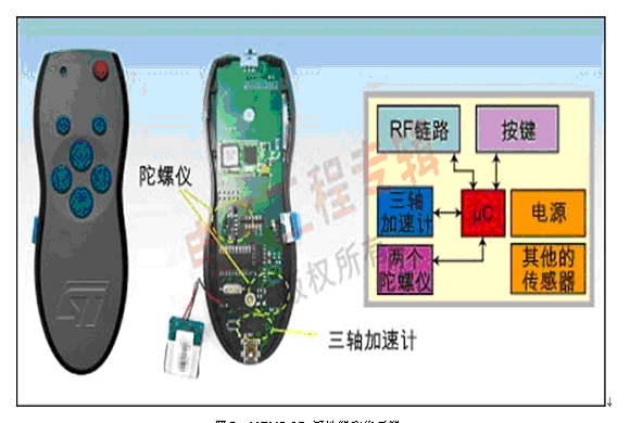 MEMS加速計(jì)與陀螺儀配合使用,可以把更先進(jìn)的選擇功能變?yōu)楝F(xiàn)實(shí),例如:能夠在空中操作的三維鼠標(biāo)和遙控器。在這些設(shè)備中,傳感器檢測到用戶的手勢,將其轉(zhuǎn)換成PC屏幕上的光標(biāo)移動(dòng)或機(jī)頂盒和電視機(jī)的頻道和功能選擇。圖5是一個(gè)含有MEMS傳感器的遙控器解決方案,MEMS傳感器組、兩個(gè)陀螺儀和一個(gè)加速計(jì)檢測手腕或鼠標(biāo)在空中的動(dòng)作,同時(shí)微控制器執(zhí)行動(dòng)作跟蹤和手勢識別功能。然后,重組的運(yùn)動(dòng)曲線通過無線連接發(fā)送到機(jī)頂盒或PC機(jī),無線鏈路可以采用紅外或射頻,具體視應(yīng)用要求而定。