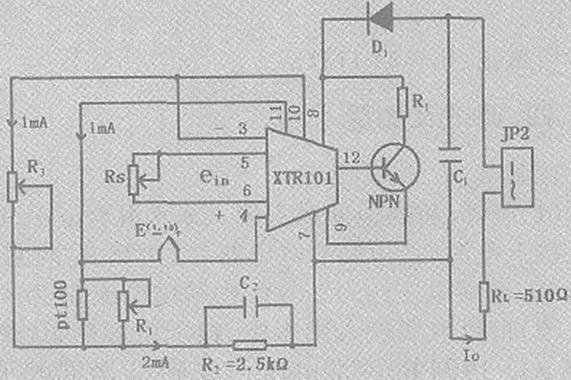 熱電偶作為感溫元件,采集溫度信號(hào);鉑電阻作為補(bǔ)償電阻,補(bǔ)償熱電偶的冷端溫度;XTR101為小信號(hào)處理專用芯片,將輸入的微弱信號(hào)放大后便于遠(yuǎn)端傳輸;RL為遠(yuǎn)端的負(fù)載電阻,便于電信號(hào)的測量。