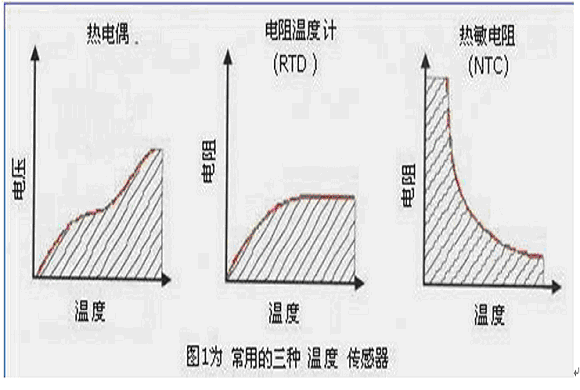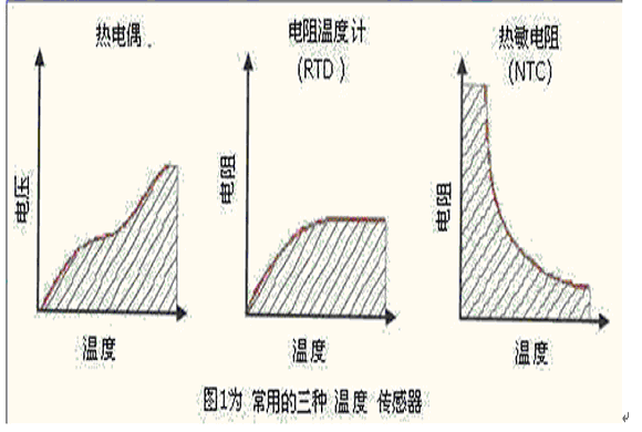 溫度是測(cè)量頻度最高的物理參數(shù),并且可采用各種各樣的傳感器來進(jìn)行測(cè)量。所有這些傳感器均通過檢測(cè)某種物理特性的變化來推斷溫度。最常用的三種溫度傳感器是熱電偶、電阻溫度計(jì)(rtd)和ntc熱敏電阻,見圖1所示。值此先作介紹。