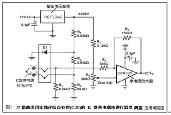 圖4為該應(yīng)用電路圖。該熱電偶測(cè)量電路采用自動(dòng)置零、單電源放大器opa335。精密電壓基準(zhǔn)ref3040提供4.096v的橋式電源。二極管d1的正向電壓具有-2mv/℃的負(fù)溫度系數(shù),并通過電阻器網(wǎng)絡(luò)r1-r3來提供冷結(jié)點(diǎn)補(bǔ)償。