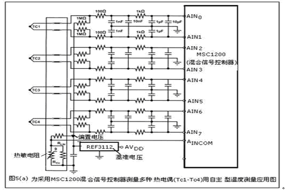 圖5(a)為采用mscl200的多熱電偶用自主型溫度測(cè)量應(yīng)用圖。該溫度測(cè)量電路采用混合信號(hào)控制器mscl200來測(cè)量四種不同類型的熱電偶(tc1-tc4)的差分輸出電壓和參考溫度。