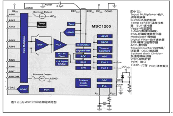 mscl200集成了具有22位有效分辨率的△∑型adc、通用型輸入多路轉(zhuǎn)換器、可選輸入緩沖器和增益調(diào)節(jié)范圍為1-128的可編程增益放大器(pga) ,見圖5(b)所示。該器件包括片上溫度傳感器、快閃存儲(chǔ)器和sram存儲(chǔ)器以及改良型8051-cpu(在功耗相同的情況下,其運(yùn)行速度可達(dá)最初標(biāo)準(zhǔn)版本的3倍)。片上電流數(shù)字-模擬轉(zhuǎn)換器(1-dac)可提供至rtd和熱敏電阻的激勵(lì)電流。其mscl200混合信號(hào)控制器內(nèi)部框圖見圖5(b)所示。