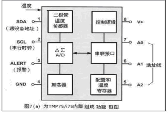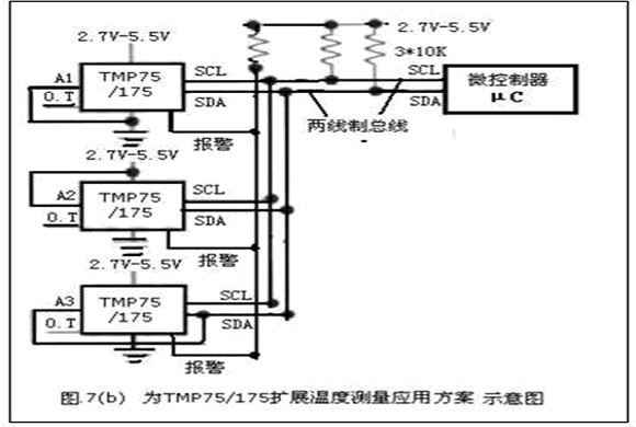 tmp75 和tmpl75是二線式、串行輸出溫度傳感器,其內(nèi)部組成框圖見圖7(a)所示。這些器件無需使用外部元件,并能夠以0.0625℃的分辨率來顯示溫度讀數(shù)。二線式接口與smbus兼容,從而允許tmpl75在一根總線上連接多達(dá)27部設(shè)備(而tmp75則最多可在一根總線上連接8部設(shè)備)。這兩款器件均具有smbus報(bào)警功能,是工業(yè)環(huán)境中常見的擴(kuò)展溫度測(cè)量應(yīng)用(見圖7(b)所示)的理想選擇。