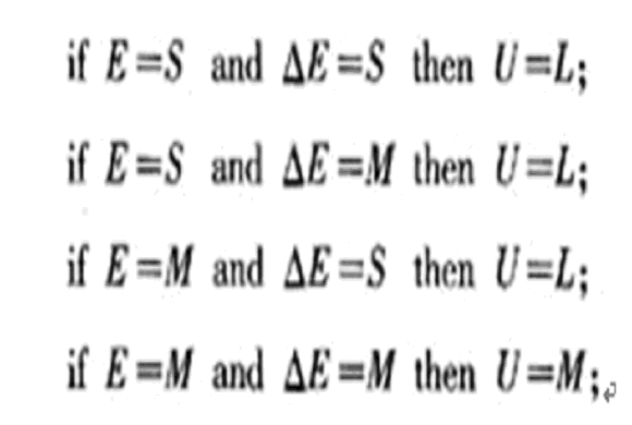 基于神經(jīng)網(wǎng)絡(luò)在推理方面不足,故借助于模糊控制強(qiáng)大的推理功能,提取有效的條件語句,進(jìn)而加快網(wǎng)絡(luò)的訓(xùn)練速度。選取偏差E和偏差變化率△E作為輸入和控制量U作為輸出。偏差E和偏差變化率△E的模糊量分別為大(L),中(M),小(S),創(chuàng)立描述條件推理表格如表1。
