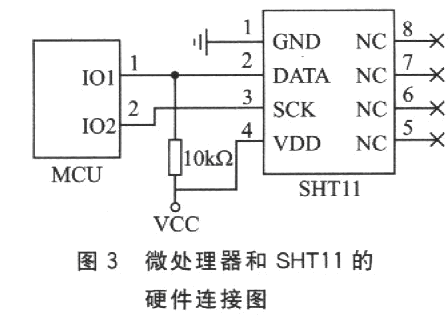 SHTl1通過二線數(shù)字串行接口來訪問,所以硬件接口電路非常簡單。需要注意的地方是:DATA數(shù)據(jù)線需要外接上拉電阻,時鐘線SCK用于微處理器和SHTll之間通信同步,由于接口包含了完全靜態(tài)邏輯,所以對SCK最低頻率沒有要求;當(dāng)工作電壓高于4.5V時,SCK頻率最高為10 MHz,而當(dāng)工作電壓低于4.5 V時,SCK最高頻率則為1 MHz。硬件連接如圖3所示。