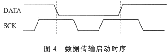微處理器和溫濕度傳感器通信采用串行二線接口SCK和DATA,其中SCK為時鐘線,DATA為數(shù)據(jù)線。該二線串行通信協(xié)議和I2C協(xié)議是不兼容的。在程序開始,微處理器需要用一組“啟動傳輸”時序表示數(shù)據(jù)傳輸?shù)膯樱鐖D4所示。當(dāng)SCK時鐘為高電平時,DATA翻轉(zhuǎn)為低電平;緊接著SCK變?yōu)榈碗娖剑S后又變?yōu)楦唠娖?在SCK時鐘為高電平時,DATA再次翻轉(zhuǎn)為高電平。