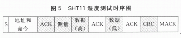 SHTll濕度測試時序如圖5所示。其中,陰影部分為SHTll控制總線。主機發(fā)出啟動命令,隨后發(fā)出一個后續(xù)8位命令碼。該命令碼包含3個地址位(芯片設(shè)定地址為000)和5個命令位;發(fā)送完該命令碼,將DATA總線設(shè)為輸入狀態(tài)等待SHTll的響應(yīng);SHTll接收到上述地址和命令碼后,在第8個時鐘下降沿,將DATA下拉為低電平作為從機的ACK;在第9個時鐘下降沿之后,從機釋放DATA(恢復(fù)高電平)總線;釋放總線后,從機開始測量當(dāng)前濕度,測量結(jié)束后,再次將DATA總線拉為低電平;主機檢測到DATA總線被拉低后,得知濕度測量已經(jīng)結(jié)束,給出SCK時鐘信號;從機在第8個時鐘下降沿,先輸出高字節(jié)數(shù)據(jù);在第9個時鐘下降沿,主機將DATA總線拉低作為ACK信號,然后釋放總線DATA;在隨后8個SCK周期下降沿,從機發(fā)出低字節(jié)數(shù)據(jù);接下來的SCK下降沿,主機再次將DATA總線拉低作為接收數(shù)據(jù)的ACK信號;最后8個SCK下降沿從機發(fā)出CRC校驗數(shù)據(jù),主機不予應(yīng)答(NACK)則表示測量結(jié)束。
