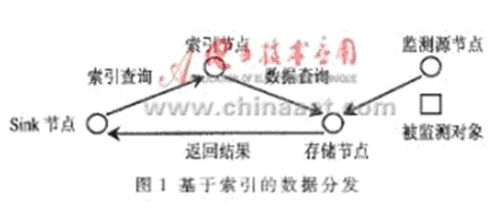 (4)基于索引的數(shù)據(jù)分發(fā)方案(index-based data dissemination scheme)[3],這種方案克服了以上幾種方案存在的問題。在這種方案中,負(fù)責(zé)監(jiān)測某對象的源節(jié)點定期產(chǎn)生該監(jiān)測對象的感知數(shù)據(jù),并存儲到存儲節(jié)點上,存儲節(jié)點可能是該源節(jié)點,也可能是鄰近的某個節(jié)點。同時,存儲節(jié)點的位置信息(稱為索引),要增加到索引節(jié)點上。當(dāng)sink節(jié)點想查詢某個被監(jiān)測對象產(chǎn)生的感知數(shù)據(jù)時,就發(fā)送一條查詢消息給有關(guān)的索引節(jié)點,索引節(jié)點收到該消息后轉(zhuǎn)發(fā)查詢請求給相應(yīng)的存儲節(jié)點,由存儲節(jié)點直接發(fā)送查詢結(jié)果給sink節(jié)點。其基本思想如圖1所示。這種數(shù)據(jù)分發(fā)方案避免了發(fā)送不需要的感知數(shù)據(jù),也不需要把控制信息泛洪到整個網(wǎng)絡(luò),改善了整個系統(tǒng)的性能,但是增加了維護(hù)索引節(jié)點的額外費用。