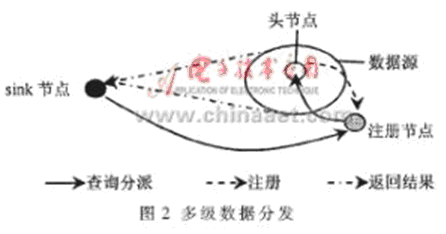 (5)多級數(shù)據(jù)分發(fā)方案(multi-resolution data dissemination scheme)[4],綜合了LS和DCS數(shù)據(jù)分發(fā)方案的技術(shù)。其基本思想是在數(shù)據(jù)源中選擇一個頭節(jié)點,代表源節(jié)點在最近的注冊節(jié)點上進(jìn)行注冊。sink節(jié)點把查詢發(fā)送到所有注冊節(jié)點上,從注冊節(jié)點再把查詢發(fā)送到所有匹配的頭節(jié)點,當(dāng)頭節(jié)點收到查詢后,在數(shù)據(jù)源內(nèi)選擇一組節(jié)點進(jìn)行查詢。由于sink節(jié)點的位置包含在它分派的查詢中,查詢節(jié)點可以直接把感知數(shù)據(jù)發(fā)送給sink節(jié)點,其基本思想如圖2所示。這種數(shù)據(jù)分發(fā)方案避免了查詢泛洪,能有效減少能量消耗。但是在數(shù)據(jù)源中只是基于感知范圍參數(shù)來選擇查詢節(jié)點,沒有考慮數(shù)據(jù)的分布情況。