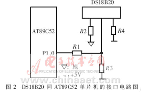 DS18B20的測溫原理為:內(nèi)部計數(shù)器對一個受溫度影響的振蕩器的脈沖計數(shù),低溫時振蕩器的脈沖可以通過門電路,而當(dāng)?shù)竭_某一設(shè)置高溫時,振蕩器的脈沖無法通過門電路。計數(shù)器設(shè)置為-55℃時的值,如果計數(shù)器到達0之前門電路未關(guān)閉,則溫度寄存器的值將增加,這表示當(dāng)前溫度高于-55℃。同時,計數(shù)器復(fù)位在當(dāng)前溫度值上,電路對振蕩器的溫度系數(shù)進行補償,計數(shù)器重新開始計數(shù)直到回零。如果門電路仍然未關(guān)閉,則重復(fù)以上過程。溫度轉(zhuǎn)換所需時間不超過750ms,得到的溫度值的位數(shù)因分辨率不同而不同[2]。DS18B20同AT89C52單片機的接口電路如圖2所示。這種接口方式只需占用單片機一根口線,與智能儀器或智能測控系統(tǒng)中的其它單片機或DSP的接口也可采用類似的方式。