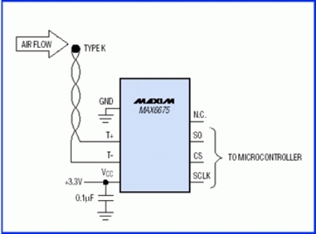 圖1. 采用熱電偶測(cè)量環(huán)境溫度,MAX6675提供冷端補(bǔ)償,并將熱電偶輸出轉(zhuǎn)換成數(shù)字形式。