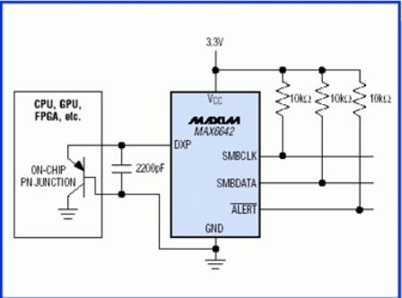 Maxim提供幾種專門(mén)設(shè)計(jì)用來(lái)精確測(cè)量熱二極管溫度并將其直接轉(zhuǎn)換成數(shù)字形式的IC。在這些IC中,其中一些可測(cè)量一個(gè)熱二極管,而有些則能同時(shí)測(cè)量多達(dá)4個(gè)熱二極管。雖然熱二極管的輸出信號(hào)電平很小(可低至200µV/°C量級(jí)),但仍大于熱電偶的輸出信號(hào)電平。內(nèi)部及外部濾波,再加上合理的電路布局,使得遠(yuǎn)端二極管溫度傳感器能夠被廣泛用于具有很強(qiáng)電氣噪聲的設(shè)備中,例如計(jì)算機(jī)、服務(wù)器及工作站等。這些IC中的大多數(shù)都能提供其他功能來(lái)保護(hù)目標(biāo)IC,例如過(guò)溫告警引腳,如果溫度超過(guò)目標(biāo)的安全工作極限,則能用它來(lái)關(guān)斷系統(tǒng)。圖2給出了遠(yuǎn)端二極管溫度傳感器(MAX6642)的一個(gè)例子。這種IC可測(cè)量熱二極管和其自身的溫度,測(cè)量上限可高達(dá)150°C,同時(shí)還提供過(guò)溫告警輸出,觸發(fā)溫度可通過(guò)SMBus編程。