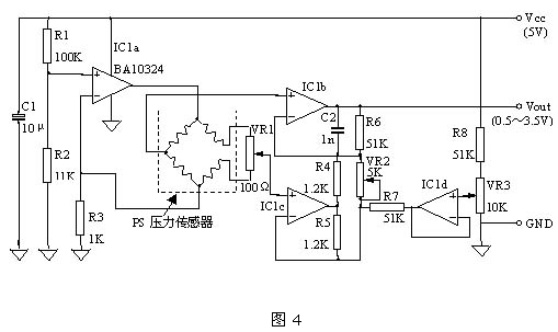 由于橋路失衡時(shí)的輸出電壓比較小,所以必須用運(yùn)放IC1b和IC1C來進(jìn)行放大。圖中VR1為偏置調(diào)整,VR2為壓力靈敏度調(diào)整,VR3為沒有加壓時(shí)輸出電壓調(diào)整,C1、C2用于去除噪聲。另外,如果電源電壓波動(dòng)的話,將引起輸出電壓的變化,所以必須給電路提供一個(gè)穩(wěn)定的電源。