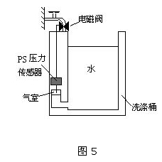 圖5是PS壓力傳感器在全自動(dòng)洗衣機(jī)中的應(yīng)用實(shí)例。如圖所示,利用氣室,將在不同水位情況下水壓的變化,作為空氣壓力的變化檢測出來,從而可以在設(shè)定的水位上自動(dòng)停止向洗衣機(jī)注水。
