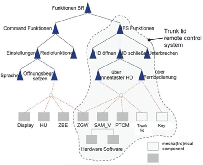 圖3是一個(gè)后備箱蓋的工作功能樹。在這里,打開后備箱實(shí)際上需要激活兩個(gè)ECU裝置。其余的ECU用來執(zhí)行顯示和控制等功能。