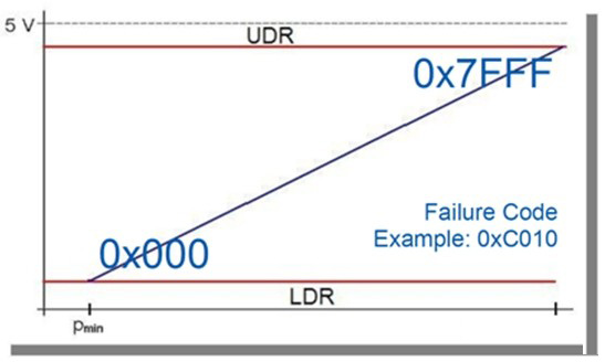 模擬輸出只允許進(jìn)行信號(hào)范圍內(nèi)(如10-90%)的傳感器信號(hào)傳輸,并通過開關(guān)將低診斷范圍(LDR)和高診斷范圍(UDR)轉(zhuǎn)換為故障狀態(tài)。因此,其無法傳送更詳細(xì)的故障信息。