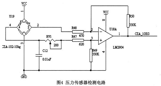 圖4為壓力傳感器的應(yīng)用電路圖,該電路采用的電橋構(gòu)成測量電壓,是一種具有較高靈敏度的測量方法。無差壓時,電橋兩臂平等。差壓信號加到4個陶瓷壓敏電阻上,壓敏電阻的阻值隨差壓而變化,引起電橋失衡。電橋失衡引起電流的變化,通過運放LM2904進(jìn)行電流的放大在后面接ADC0834模數(shù)轉(zhuǎn)換芯片,把模擬信號轉(zhuǎn)化為數(shù)字信號,再傳輸至CPU進(jìn)行處理。