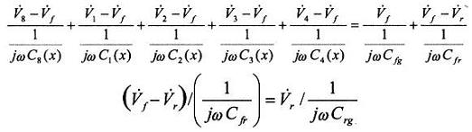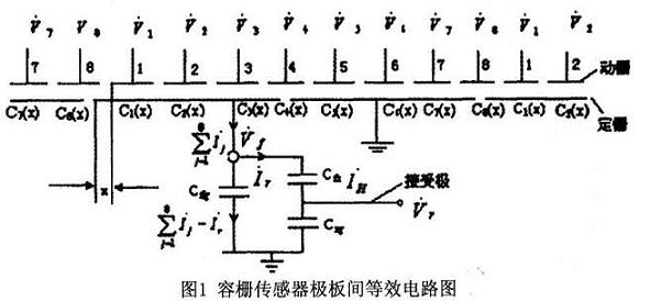 相應(yīng)的信號源全部落在這些電容上,同樣,對傳感器的輸出信號無影響。如果給容柵傳感器每組發(fā)射極板上所加的發(fā)射電壓V1~V8為8路頻率、幅值相同而相鄰小極板間相位相差為π/4的正弦交變電壓,則在發(fā)射極上有電壓Vf,在接收極上有電壓Vr。應(yīng)用交流電路理論及基爾霍夫電流定律,解讀圖l的等效電路,如下: