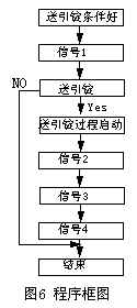 根據(jù)光檢測電裝置的工作過程,只要現(xiàn)場測定送引錠過程中各個(gè)光電信號發(fā)生的時(shí)間,結(jié)合送引錠過程與光電信號的關(guān)系,利用PLC應(yīng)用程序中的相關(guān)數(shù)據(jù),編制符合要求的PLC程序,將PLC程序輸出信號輸入至PLC的輸入模塊,替代原光電信號的輸入信號。其程序框圖如圖6所示。