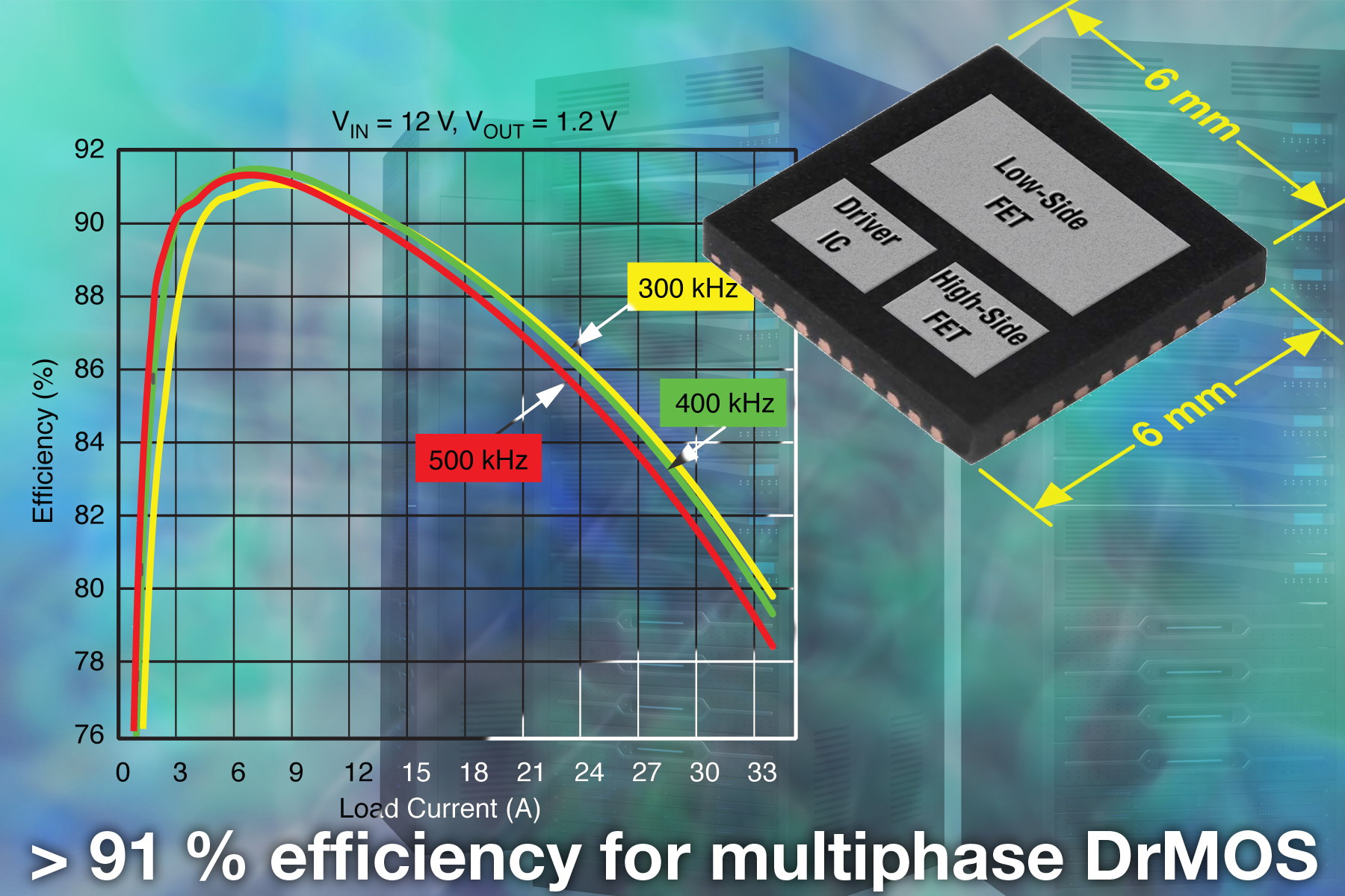 通過集成驅(qū)動IC和功率MOSFET,SiC762CD減少了功率損耗和與高頻分立功率級相關(guān)的寄生阻抗效應(yīng)。設(shè)計(jì)者可以采用高頻開關(guān)以改善瞬態(tài)響應(yīng),節(jié)省輸出濾波器的成本,在多相Vcore應(yīng)用中實(shí)現(xiàn)盡可能高的效率密度。