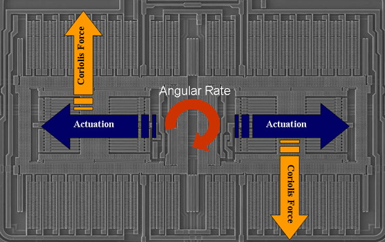 ST陀螺儀的核心元件是一個(gè)微加工機(jī)械單元,在設(shè)計(jì)上按照一個(gè)音叉機(jī)制運(yùn)轉(zhuǎn),利用科里奧利原理把角速率轉(zhuǎn)換成一個(gè)特定感應(yīng)結(jié)構(gòu)的位移。我們以一個(gè)單軸Z軸陀螺儀為例,探討最簡(jiǎn)單的工作原理(圖1)。兩個(gè)正在運(yùn)動(dòng)的質(zhì)點(diǎn)向相反方向做連續(xù)運(yùn)動(dòng),如藍(lán)色箭頭所示。只要從外部施加一個(gè)角速率,就會(huì)出現(xiàn)一個(gè)科里奧利力,力的方向垂直于質(zhì)點(diǎn)運(yùn)動(dòng)方向。產(chǎn)生的科里奧利力使感應(yīng)質(zhì)點(diǎn)發(fā)生位移,位移大小與所施加的角速率大小成正比。因?yàn)?,傳感器感?yīng)部分的運(yùn)動(dòng)電極(轉(zhuǎn)子)位于固定電極(定子)的側(cè)邊,上面的位移將會(huì)在定子和轉(zhuǎn)子之間引起電容變化,因此在陀螺儀輸入部分施加的角速率被轉(zhuǎn)化成一個(gè)專用電路可以檢測(cè)的電參數(shù)。