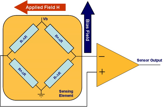 當(dāng)在一個(gè)很薄的鐵條上施加磁力線方向與經(jīng)過(guò)鐵條的電流方向垂直的磁場(chǎng)時(shí),鐵條內(nèi)的電阻就會(huì)發(fā)生變化。這種傳感器通常采用單臂電橋形式,如圖所示,電橋由靜態(tài)阻值相同的磁阻構(gòu)成。在測(cè)量過(guò)程中,電橋上施加電壓Vb,使電流通過(guò)電阻。只要磁場(chǎng)H存在,在兩組四個(gè)相反放置的電阻器中,第一組兩個(gè)電阻的磁化矢量轉(zhuǎn)向電流,使電阻值變大;而另兩個(gè)電阻的磁化矢量背離電流,使電阻值變小。在線性范圍內(nèi),傳感器輸出與所施加的磁場(chǎng)強(qiáng)度成正比。