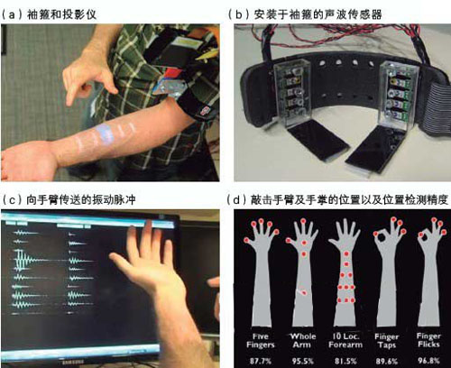 Harrison與美國(guó)微軟研究院(Microsoft Research)的研究人員開發(fā)出了以手及手臂表面作為觸摸面板的技術(shù)“Skinput”。“我們?cè)囍屏艘粋€(gè)可實(shí)際運(yùn)行的系統(tǒng)”(Harrison)。只需用手指在手掌及手臂等的表面輕輕敲擊,即可操作游戲機(jī)、音樂播放器及手機(jī)等。