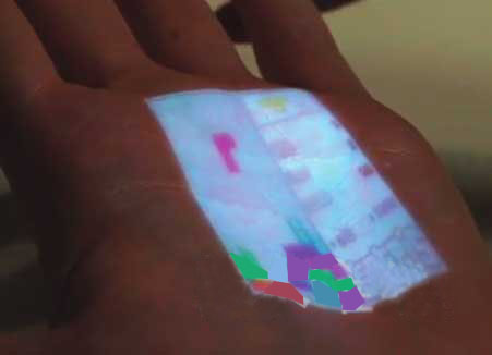 Skinput還將顯示器功能單獨(dú)分割出來。具體實(shí)現(xiàn)方法是,利用小型投影儀,將手掌及手臂作為顯示器使用(右上方的圖片)。