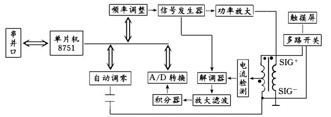 加到觸摸屏的右邊電極上,觸摸屏的上邊和下邊電極全部開路,這樣在觸摸屏的X 方向上建立了交流電壓梯度,經(jīng)解調(diào)器解調(diào)和濾波后,可得到X 方向上的觸摸電流為iX= KXXV/ Zf ,其中,V為變壓器次級對于中心抽頭虛地的電壓,KX 為常量,V/ Zf 為電路等價阻抗觸摸電流。第2 種模式為將SIG+加到觸摸屏的左邊電極上,同時也加到觸摸屏的右邊電極上,這時在X 方向上建立了均勻的交流電壓。如果在觸摸屏上任意一點(diǎn)進(jìn)行觸摸,則經(jīng)解調(diào)器解調(diào)和濾波后,得到其觸摸電流為i ZX= KZXV/ Zf ,其中,KZX為常量。由iX 和iZX得X 方向的觸摸位置坐標(biāo)為X= (KZX/ KX)·( iX/ i ZX ) ,式中,iX、iZX在以上2 種掃描模式下測得,而常量KZX/ KX 可由實驗確定。一旦確定了KZX / KX,就可計算出X 方向的任意觸摸位置坐標(biāo)X。同樣,第3 種模式是將SIG+和SIG-分別加到觸摸屏的上邊電極和下邊電極上,即可得到Y(jié)方向上的觸摸電流為i Y= KYYV/ Zf ,其中,KY 為常量。第4種模式是同時將SIG+加到觸摸屏的上邊電極和下邊電極上,得等價阻抗觸摸電流為 iZY= KZYV/ Zf ,其中,KZY為常量。也可由 iY 和 iZY得Y 方向的觸摸位置坐標(biāo)為 Y=(KZY/ KY) ( i Y/ i ZX) ,其中,常量KZY/ KY 同樣可由實驗確定。
