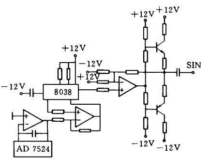 控制器的激勵信號源如圖3 所示。信號由函數(shù)信號發(fā)生器8038 產(chǎn)生,它能夠輸出正弦波和方波,正弦波用作觸摸屏的激勵信號。單片機(jī)通過 8 位 D/ A 轉(zhuǎn)換器可控制8038 的振蕩頻率,一般控制在200 kHz 左右,以避開計算機(jī)顯示器掃描信號產(chǎn)生的干擾。同時,由8038 產(chǎn)生的方波信號提供給模擬解調(diào)器,作為解調(diào)信號參考源。由于8038輸出的正弦波信號功率有限,為此在8038的正弦波信號輸出端增加了功率放大電路。