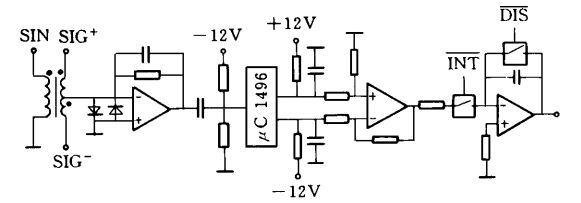 在沒有觸摸的情況下,由于元器件的誤差等原因,變壓器次級中心抽頭上的電流不一定為零,從而引起測量誤差,為此本控制器設(shè)置了自動調(diào)零電路,如圖5 所示。該電路將12 位D/ A 轉(zhuǎn)換器DAC1230 的輸出,通過電容耦合到SIG-信號上,使得變壓器次級中心抽頭上的電流調(diào)整為零。