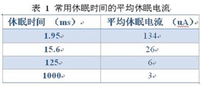 CY8C22x45系列芯片休眠時的工作電流僅有3uA[5],芯片內(nèi)包含一個休眠計數(shù)器,系統(tǒng)進(jìn)入休眠后計數(shù)器開始遞減,當(dāng)計數(shù)值為零時產(chǎn)生中斷喚醒系統(tǒng)。喚醒系統(tǒng)后可以不做任何處理再次進(jìn)入休眠模式。這樣周而復(fù)始,達(dá)到所需要的整個休眠時間。在實際設(shè)計中,常常使用平均休眠電流替代公式2中的Isleep,即在每次休眠結(jié)束后,僅讓系統(tǒng)正常工作最短時間,該時間內(nèi)完成所有必須操作(僅是一次循環(huán)判斷),此時的電流即為該休眠時間下的平均休眠電流。表1列出了常用休眠時間的平均休眠電流。