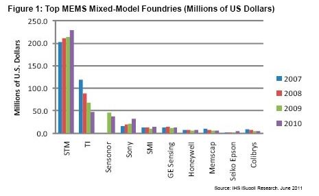 STM是一家由意大利和法國(guó)公司合并而成的公司,總部設(shè)在瑞士日內(nèi)瓦。該公司2010年MEMS制造服務(wù)營(yíng)業(yè)收入為2.286億美元,而美國(guó)德州儀器只有4740萬美元。圖1所示為IHS iSuppli公司的10大MEMS廠商排名,其生產(chǎn)的MEMS器件供自身使用或?yàn)樗舜ぁ?br />