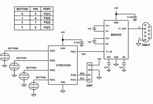 為了實(shí)現(xiàn)電容式傳感和串行通信,該電路采用了賽普拉斯的CY8C21x34系列中的PSoC IC芯片。該芯片包含一組模擬和數(shù)字功能塊,這些功能塊可由存儲(chǔ)于板上閃存中的固件來(lái)配置。另一顆芯片負(fù)責(zé)處理RS232的電平移位,以便建立到主機(jī)的通信鏈接,并實(shí)現(xiàn)波特率為115,200的電容式傳感數(shù)據(jù)記錄。四個(gè)電容傳感按鍵的引腳分配在圖5的表中給出。PSoC是通過(guò)一個(gè)包含電源、地以及編程引腳SCL和SDA的ISSP接頭來(lái)實(shí)現(xiàn)編程的。而通過(guò)一個(gè)DB9連接器將電腦與電容式傳感電路板相連。
