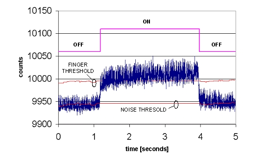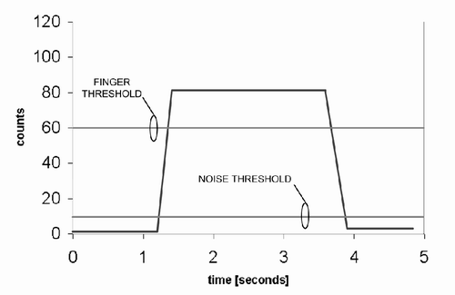 噪聲門限被設(shè)定的計(jì)數(shù)值為10,而手指門限設(shè)定的計(jì)數(shù)值則為60。實(shí)際上,在實(shí)際計(jì)數(shù)數(shù)據(jù)中噪聲分量是始終存在,圖中沒(méi)有顯示是為了能清晰地顯示門限水平。