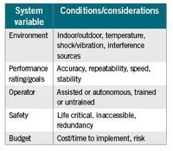 MEMS慣性傳感器可靠度高(汽車行業(yè)20年的應(yīng)用歷史證明了這一點(diǎn)),它在手機(jī)和視頻游戲中的成功應(yīng)用說(shuō)明它在商業(yè)上極具吸引力。然而,不同應(yīng)用對(duì)性能的要求大不相同,適合游戲的器件并不能解決本文所述的高性能導(dǎo)航問(wèn)題。對(duì)于導(dǎo)航,重要的MEMS性能指標(biāo)是偏置漂移、振動(dòng)影響、靈敏度和噪聲。精密工業(yè)和醫(yī)療導(dǎo)航所需的性能水平通常比消費(fèi)電子設(shè)備所用MEMS傳感器的性能水平高出一個(gè)數(shù)量級(jí)。表3列出了有助于傳感器選型的一般系統(tǒng)考慮。