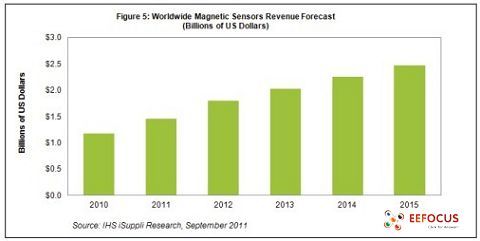預(yù)計(jì)今年硅磁傳感器銷售額將達(dá)到14.6億美元。2010年該市場大增48.6%,達(dá)到11.8億美元。鑒于乘用車產(chǎn)業(yè)強(qiáng)勁復(fù)蘇,以及羅盤在手機(jī)和平板電腦中得到更多應(yīng)用,未來幾年磁傳感器市場前景相當(dāng)樂觀。