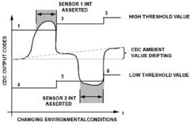隨著環(huán)境條件的變化(例如,溫度或濕度上升),傳感器的環(huán)境參數(shù)(在用戶沒有與傳感器接觸期間,由CDC進行測量)會發(fā)生漂移。為了進行補償,需要動態(tài)改變高端和低端閾值電平,以確定有效的傳感器接觸。位置2、3、5、6處的參考電平進行重新調整,以保持最佳的閾值參考電平,從而自動跟蹤和補償漂移誤差。