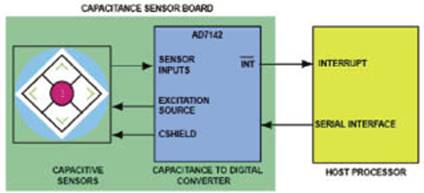電容觸摸傳感器接口通常由一個電容傳感器、一個電容數(shù)字轉換器(CDC)和一個主處理器組成(圖1)。傳感器利用標準兩層或四層PCB上的走線(trace)或柔性電路制造,因此不需要任何外部元件或材料。