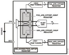 PCB還可能受到寄生電容的影響,這種電容最大可達20 pF,它會在電容觸摸傳感器視為受到按壓時,使閾值發(fā)生偏移,從而改變其靈敏度。為了對寄生電容進行補償,可以采用對DAC編程的方法,以抵消CDC的輸入。對于各PCB來說,這種寄生電容是一致的,因此可以在制造PCB的時候進行簡單的調整,這樣就不需要外部RC調諧元件,從而使材料、裝配和測試相關的成本最低。單獨調整每個傳感器的偏移,使設計者可以充分利用轉換器的分辨率(圖3)。