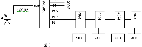 接收器部分,主要由CX20106和89C2051、顯示驅(qū)動4094、2803及數(shù)據(jù)存儲器和看門狗25045組成,用解碼芯片CX20106把38K的載波過濾后,得到一組波形,即以波特率為1200的串口數(shù)據(jù),直接送至89C2051的RXD接收,用軟件讀取串口,輸入緩存,得到一組數(shù)據(jù),判斷正確后,存放在非易失性的EEPROM25045中,同時直接用脈沖移位方式,送數(shù)據(jù)至4094,經(jīng)2803驅(qū)動后顯示,同時用25045的看門狗定時,保證在程序失控等情況下,能正確返回而不造成錯誤接收。由于串行口方式傳輸,本身帶有奇偶校驗和起停位校驗,可以大大提高數(shù)據(jù)的可靠性,同時在數(shù)據(jù)組中還加入了累加和校驗,再次提高了可靠性,因此在實際應(yīng)用中,即使在露天、太陽直射、光照很強(qiáng)等惡劣環(huán)境下,都能保證不會誤收數(shù)據(jù)而造成顯示錯誤。其原理圖如下:
