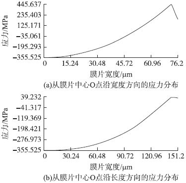 犧牲層厚度H2 < 1.6 μm 時,隨著犧牲層厚度的減小,使膜片與襯底剛好接觸所加載的壓力也隨之減小,當(dāng)犧牲層厚度減小使該加載壓力減小到剛好滿量程壓力時,犧牲層厚度不可再減小,否則傳感器在量程范圍內(nèi)將出現(xiàn)了非線性形變,這樣便確定了減小犧牲層厚度提高過載能力的極限值。經(jīng)過仿真,膜片長度a = 300 μm、寬度b = 150 μm、膜片厚度H1 = 3 μm 時,對應(yīng)的犧牲層厚度最小值為0.3μm。下面利用有限元分析軟件對此參數(shù)的壓力傳感器進(jìn)行非線性接觸分析。按照模型建立、網(wǎng)格劃分、接觸對建立、加載、求解的順序進(jìn)行模擬仿真。當(dāng)最大應(yīng)力達(dá)到硅的斷裂強度時,加載壓力為1.55MPa,仿真結(jié)果如圖4 所示,其中點O 處于膜片中心。