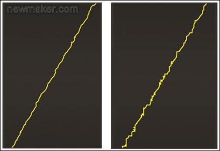 圖3. 一個機器臂握著4mm金屬片畫的直線。左側使用的是高SNR的觸摸屏控制器;右側使用的是低SNR觸摸屏控制器