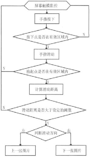 當(dāng)手指按下時(shí),首先判斷按下點(diǎn)的坐標(biāo)是否在設(shè)定的有效區(qū)域內(nèi),再判斷抬起點(diǎn)的坐標(biāo)是否在設(shè)定的有效區(qū)域內(nèi)。當(dāng)手指按下點(diǎn)和抬起點(diǎn)都在有效范圍內(nèi)時(shí),計(jì)算滑動(dòng)距離,若滑動(dòng)距離小于設(shè)定閾值,當(dāng)作是無效觸摸,不做任何處理?;瑒?dòng)距離大于設(shè)定的閾值且向左滑動(dòng),切換為上一張圖片;滑動(dòng)距離大于設(shè)定的閾值且向右滑動(dòng),切換為下一張圖片。