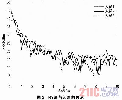 由圖2可以看出,不同的人員拿著移動(dòng)終端前進(jìn),RSSI與距離的關(guān)系曲線基本一致,說明RSSI值與距離的關(guān)系符合一定的衰減規(guī)律。