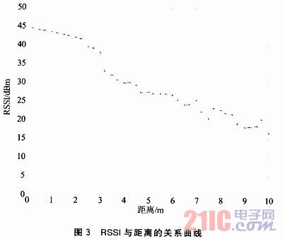 在相同的實(shí)驗(yàn)平臺(tái)下,在0~10 m的范圍內(nèi),每間隔0.2 m或者0.3 m記錄RSSI值,每個(gè)距離均接收100個(gè)左右的數(shù)據(jù)包,對RSSI先進(jìn)行均值處理,然后得出RSSI值與距離的關(guān)系曲線如圖3所示。