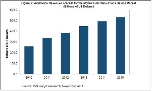 據(jù)IHS iSuppli公司的無線通信市場研究報告,智能手機和平板電腦在消費者中日益普及,今年將推動移動通信產(chǎn)品與無線基礎(chǔ)設(shè)施設(shè)備營業(yè)收入大增29%。